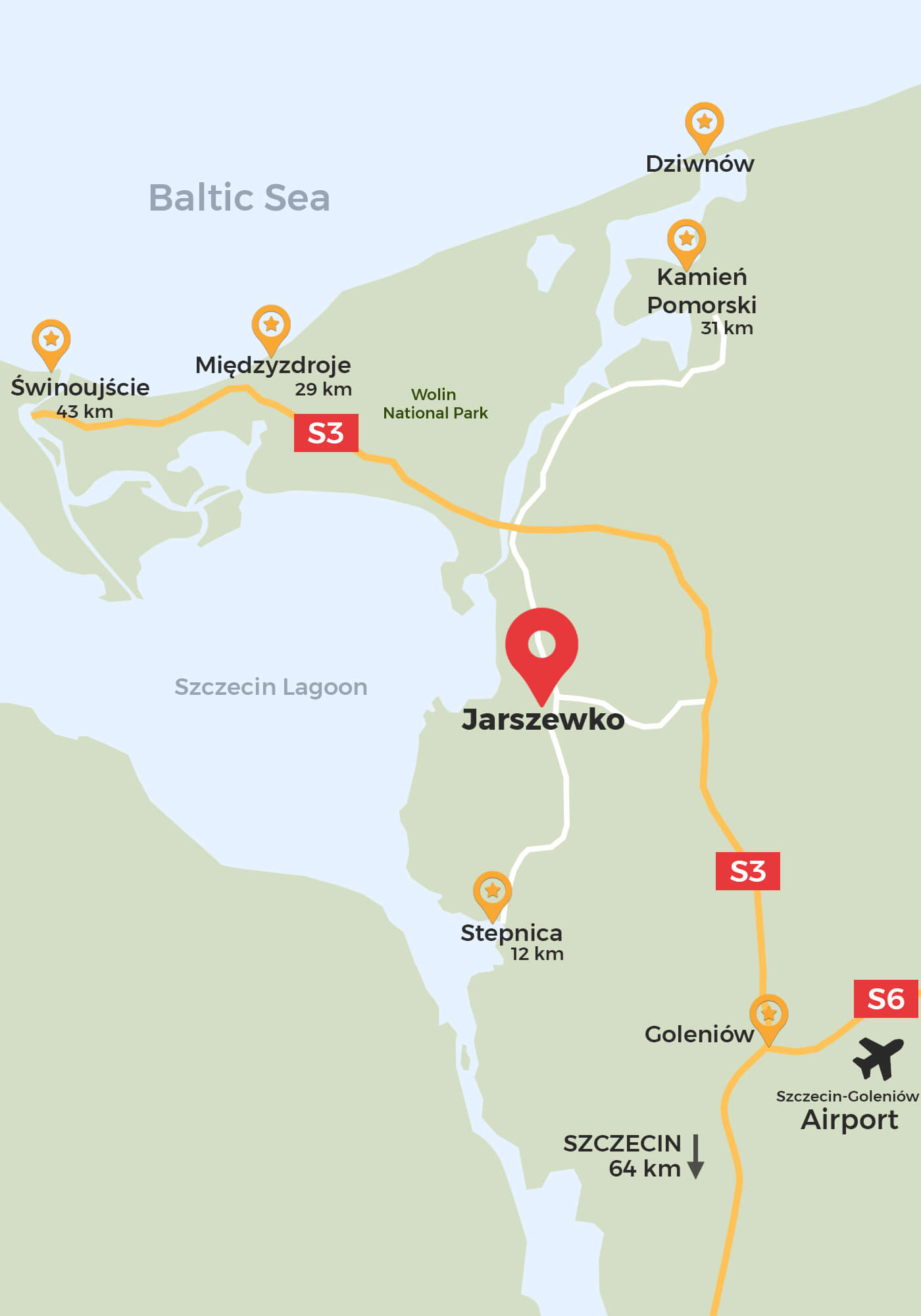 The site lies close to major transport routes – road 111, the S3, and the E65. The S3 route provides convenient access southwards toward Szczecin, Szczecin-Goleniów Airport, and the A6 motorway, and northwards to Świnoujście.